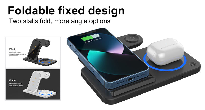 Our 3-in-1 foldable wireless charging station is designed for modern living and is suitable for charging multiple devices simultaneously, such as smartphones, watches, and wireless headphones.