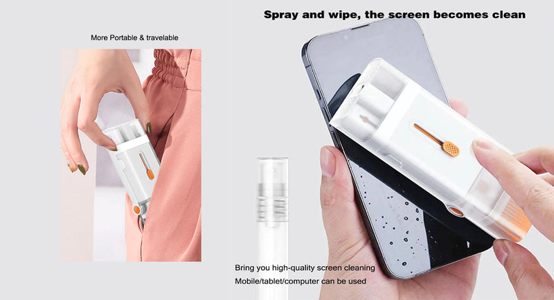 new version! Computer/Macbook/Headphones/Laptop Cleaning Set: The upgraded 8-in-1 cleaning set can be opened as a desktop phone holder! Use it as a mobile phone holder in daily life, no longer looking for cleaning tools when you want to clean your keyboard/computer/headphones, etc. Includes 1 large high-density brush, 1 card swipe, 1 headphone cleaning pen (with flocked sponge and 2 high-density brushes), 1 built-in key extractor, 1 spray bottle and plastic stand box.Foldable Headphone Cleaning Pen: Mini foldable cleaning pen with sponge wand and 2 high-density brushes, perfect for cleaning Bluetooth headphones, phones, Airpod Pro 1, 2 and other earbuds, and earbud charging cases. The flocked sponge is used to clean the holes in the charging box. Mini and medium high-density brushes are ideal for deep cleaning dirt from speakers, mesh surfaces and crevices.