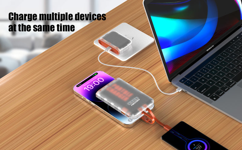 - [Unique built-in Cable]: the external battery pack Built-in lightning charging Cable and type C cable.