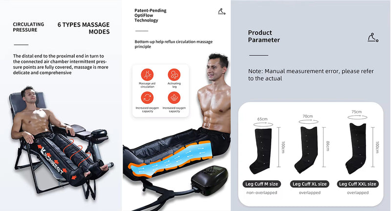Six independent airbag chambers simulate the techniques of a professional masseur by circulating pressure and relaxation, deeply massaging leg muscles, promoting blood circulation, and relieving fatigue. - Full package airbags: