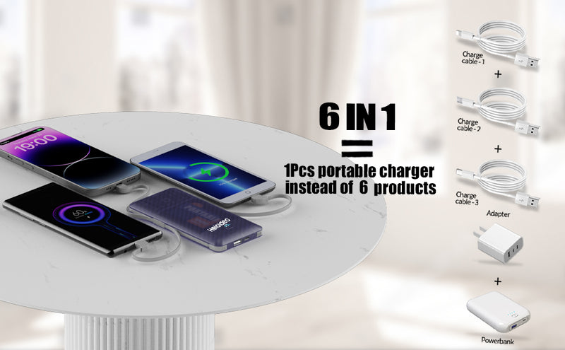 Slim 10000mAh Portable Power Bank Charger 20W USB C Fast Charging External Battery Pack Built-in AC Wall Plug Three Cables for Cell Phone,Tablet
