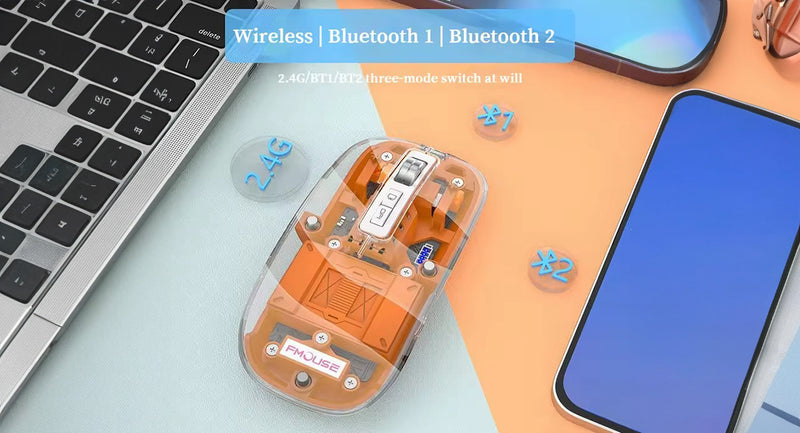 - Experience the ultimate in style, convenience, and functionality with the Wireless Rechargeable Bluetooth Mouse. Featuring BT1 BT2 2.4G three mode wireless connection, this mouse is perfect for your personal and professional needs, offering a transparent clear cool shell for matching all kinds of mouse pad, along with 4 DPI adjustable settings, mute clicks, and mini portability, making it the perfect choice for business, home, and office use.
